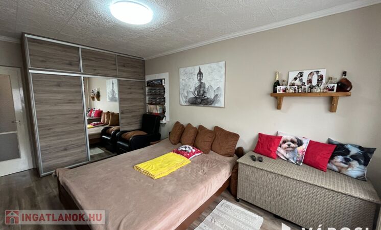 A lakás elosztása praktikus: 2 kényelmes szoba, külön fürdőszoba és WC biztosítja a lakók kényelmét. A redőnyözött ablakok mellett szúnyogháló is gondoskodik az otthon nyugalmáról, míg a beépített szekrények rengeteg tárolóhelyet kínálnak. A nagyméretű gardróbnak köszönhetően a nagyobb tárgyak elhelyezése sem okoz problémát.