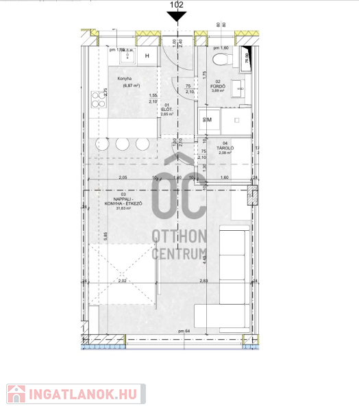 Ez az 1. emeleti lakás 40,25 nm-es, nappali-étkező- amerikai konyhás.