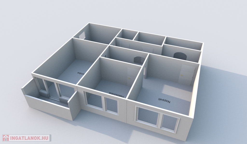 - Helyiségei: előszoba, gardrób, nappali + 2 szoba, konyha, étkező, fürdőszoba, WC külön.