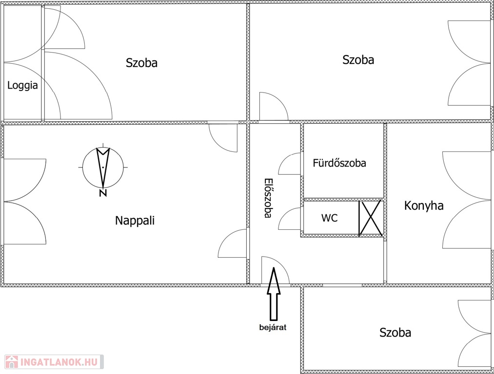 - Helyiségei: előszoba, konyha, nappali + 3 szoba, fürdőszoba, WC külön.