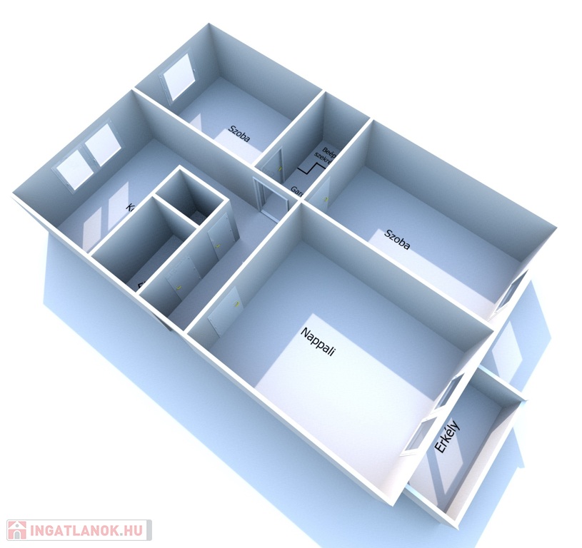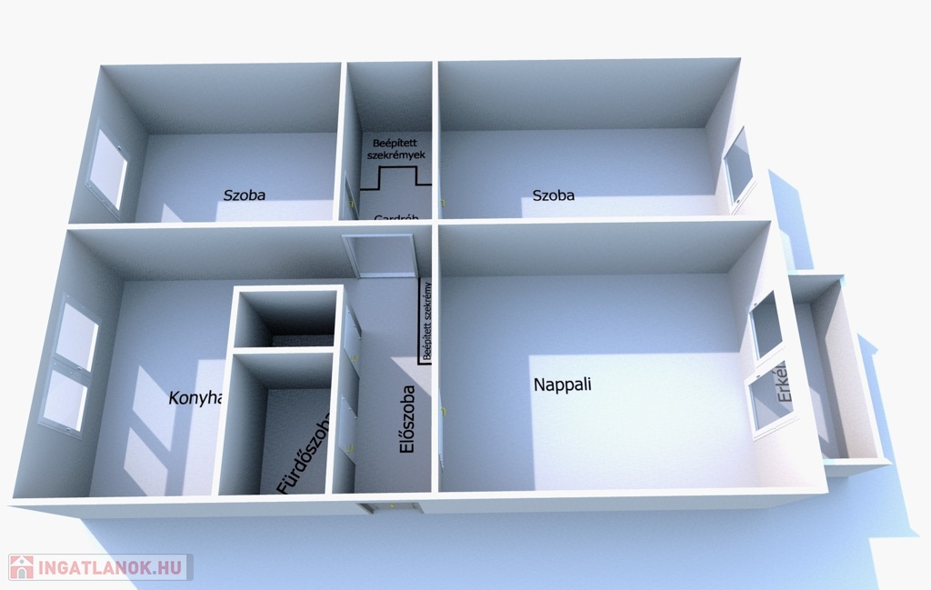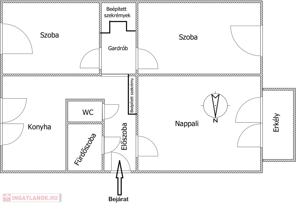 - Helyiségei: előszoba,3 külön nyíló szoba, étkezőkonyha, fürdőszoba, WC külön, gardrób, erkély.