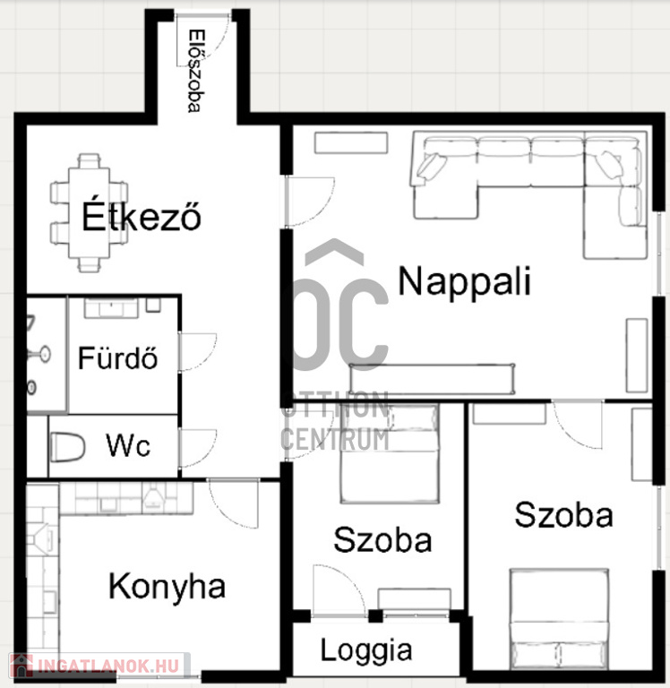 Helyiségei : nappali + 2 szoba, konyha , étkező, külön fürdő, wc, előszoba, és a loggia.
