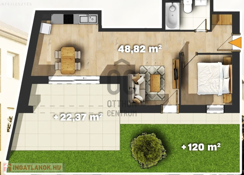 Hasznos alapterülete : 48,28 m2 + 22,37 m2 terasz + 120 m2 udvar kapcsolatos.