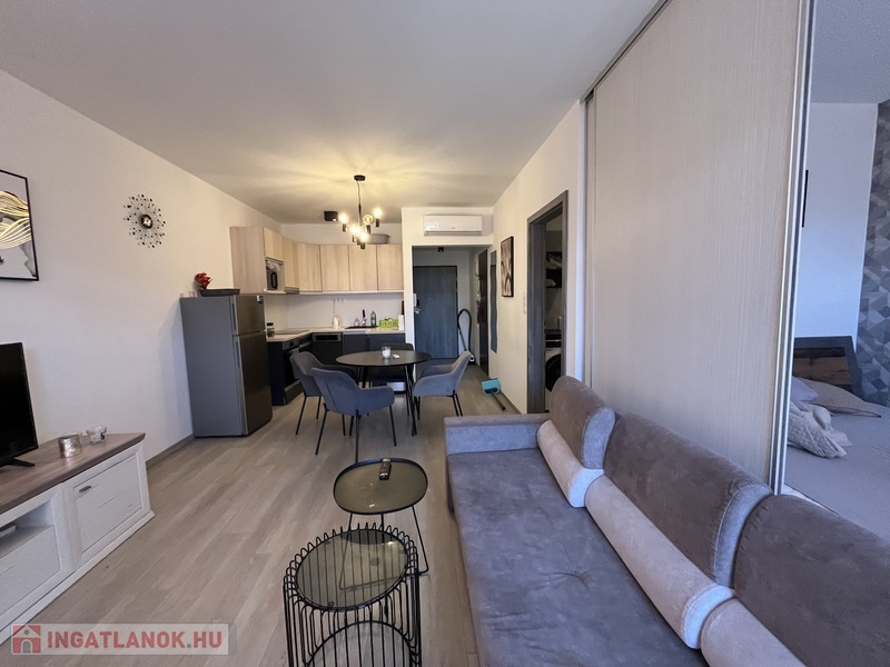 Modern és Praktikus Elrendezés: Az amerikai konyhás nappali tágas és világos teret biztosít a mindennapi élethez és a vendégfogadáshoz. Az egy külön szoba pedig nyugodt pihenést garantál.