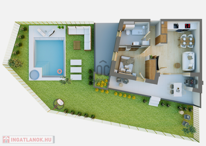Ez a földszinti kertkapcsolatos lakás 40,68 nm-es, nappali-étkező-konyha +1 szobás, 17 nm-es terasszal és 117 nm-es kerttel.