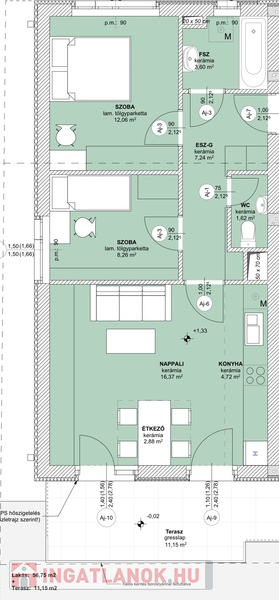 (Konyhában munkapult feletti 60 cm sáv, teljes hosszban. Fürdõszoba, toalett, közlekedõ, nappali- konyha teljes burkolását az ár tartalmazza)
