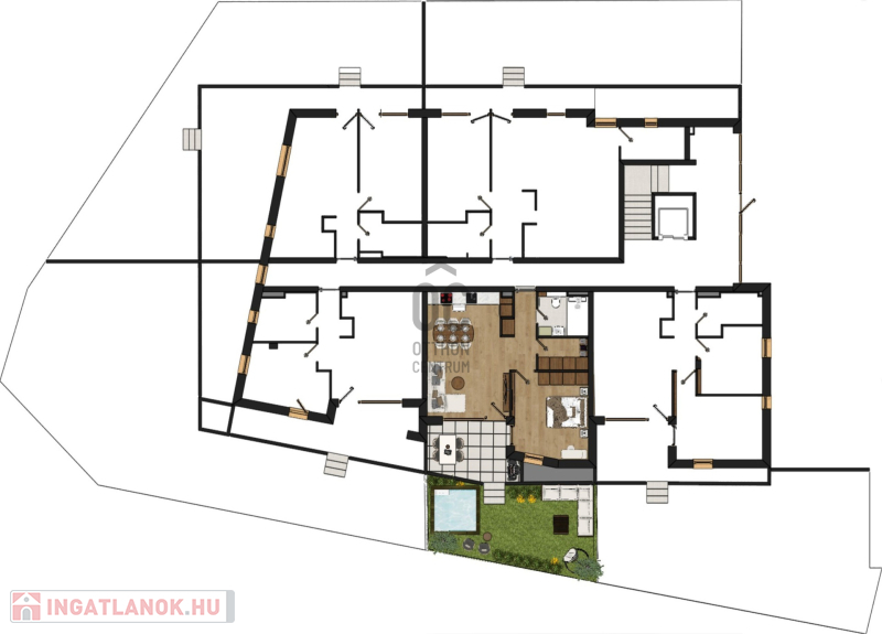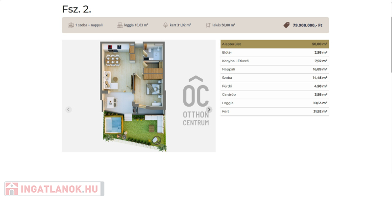 Ez a földszinti kertkapcsolatos lakás 50 nm-es, nappali-étkező-konyha +1 szobás, 10,6 nm-es terasszal és 32 nm-es kerttel.