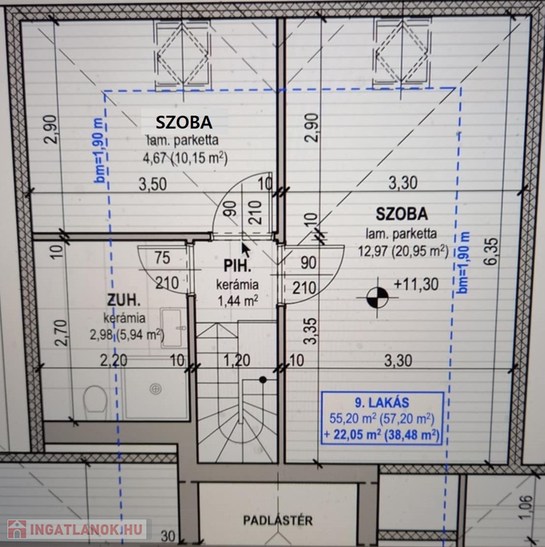Az ingatlan pontos méretei: Nettó alapterület 95.68m², ebből a hasznos alapterület, ahol a belmagasság legalább az 1,90 métert eléri 77.25m².