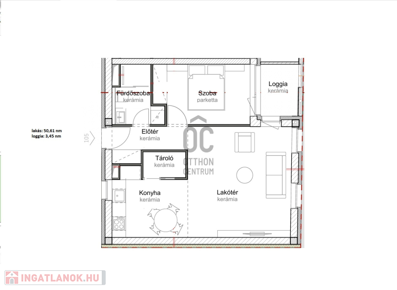 Ez az 2. emeleti lakás 49,47 nm-es, nappali-étkező-konyha +1 szobás, 6,03 nm-es loggiával. Nappali+ 2 szobássá alakítható.