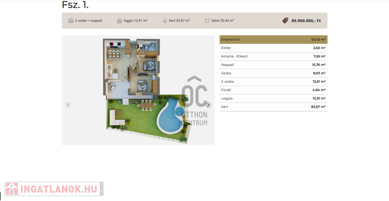 Ez a földszinti kertkapcsolatos lakás 53,42 nm-es, nappali-étkező-konyha +2 szobás, +13 nm-es terasszal és 83 nm-es kerttel.