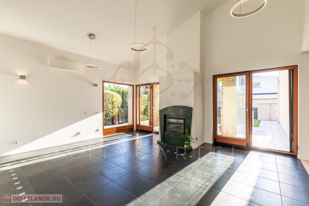 Amerikai konyhás nappali fatüzeléses kandallóval, nagy belmagassággal, közvetlen kapcsolat a kertkapcsolatos teraszokhoz
