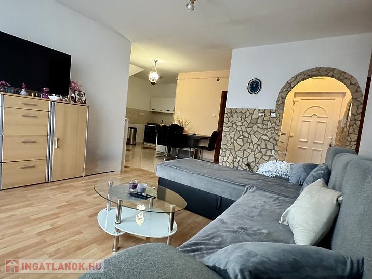 Az amerikai konyhás nappali mellett, előszobával, fürdőszobával külön WC-vel, és 3 hálószobával rendelkező lakás.