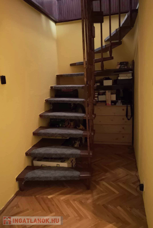 Az alsó szinten nappali, háló, konyha, fürdő és WC, míg a felső szinten három szoba, egy fürdő, valamint szintenként egy-egy erkély biztosítja a kényelmet. A két szintet belső lépcső köti össze, ugyanakkor megmaradt a két bejárat lehetősége is – így ez az otthon akár két generáció vagy lakás + vállalkozás céljára is kiváló választás lehet.