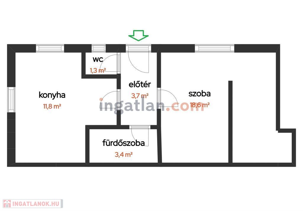 Konyha (11,8 nm), szoba (18,6 nm), előszoba (3,7 nm), fürdő (3,4 nm) és mellékhelyiség (1,3 nm).