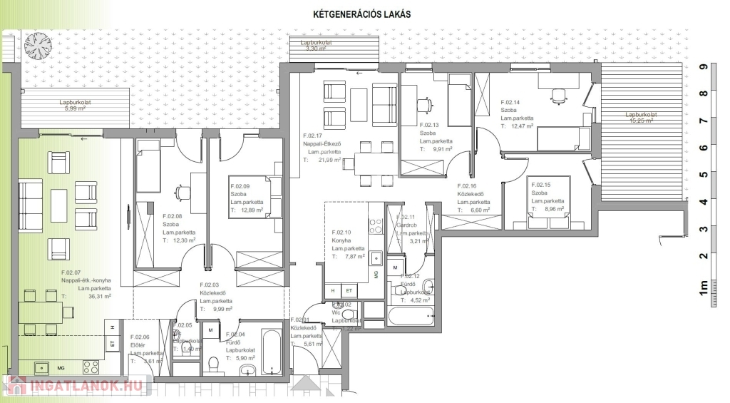 -F.02 lakás 164,3 m2; terasz: 32,85 m2; kert: 168,36 ár: 214.060.000Ft.
