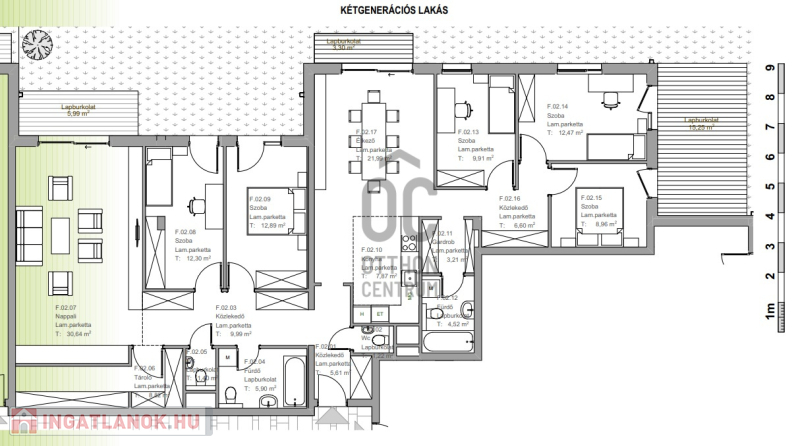 Az épület földszintjén elhelyezkedő lakás extra nagy méretű, nettó alapterülete 164,3 nm. Elvileg két-generációs kialakítású, de a beruházó még egyedi elképzeléseket is meg tud valósítani. Akár két különálló lakás is kialakítható belőle.
