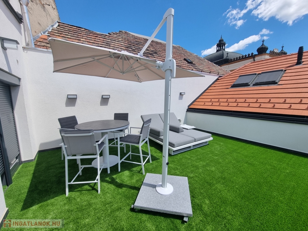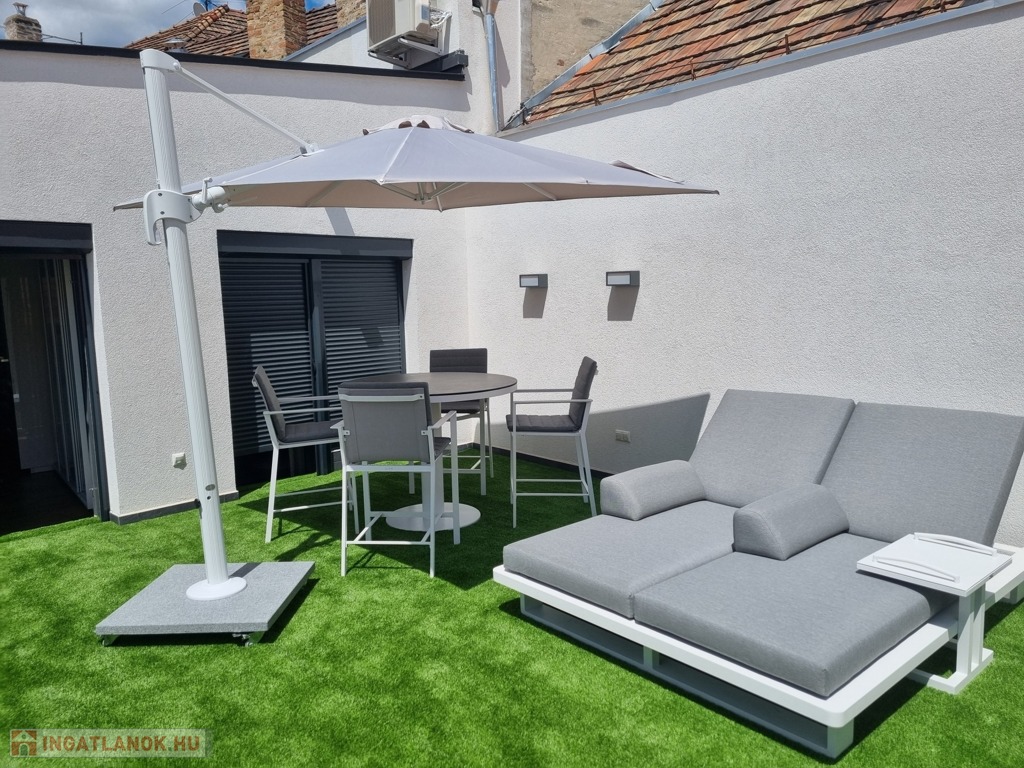A 2 szobás ingatlan egy 30 m²-es saját terasszal, valamint fedett kocsibeállóval rendelkezik. A beépített, gépesített egyedi, magas minőpségű konyha NEFF gépekkel szerelt, a bútorok az ingatlan paramétereihez igazodva, egyedileg készültek, valamint a teraszbútorzat vadonatúj - mindezek az ár részét képezik.