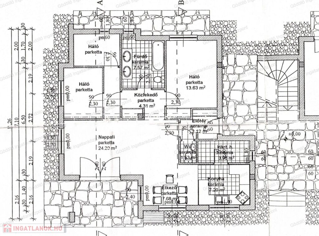 Elosztás: előtér, amerikai konyhás nappali étkezővel, 1 nagy szoba, 2 félszoba, közlekedő, kádas fürdő-WC, külön WC, mosókonyha. Tartozik hozzá 14 nm lekerített fedett terasz, 4,5 nm tároló, valamint 15 nm garázsbeálló.