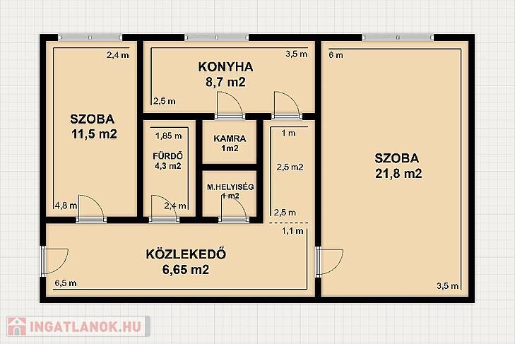 2 szoba, ablakos konyha, zuhanyzós fürdőszoba, mellékhelyiség, kamra.