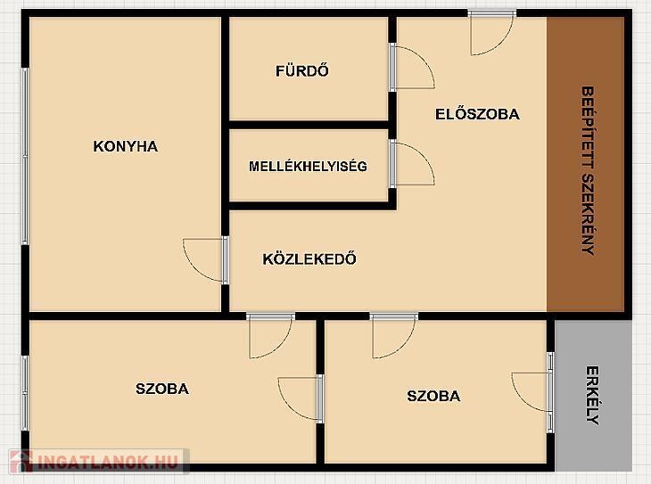 2 szoba, ablakos konyha, kádas fürdőszoba, mellékhelyiség, erkély.