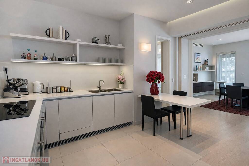 A napfény végigsimít a magasfényű felületeken, a tér pedig egyszerre letisztult, elegáns és megnyugtató – pontosan az az érzés, ami miatt ezt a lakást látni kell.