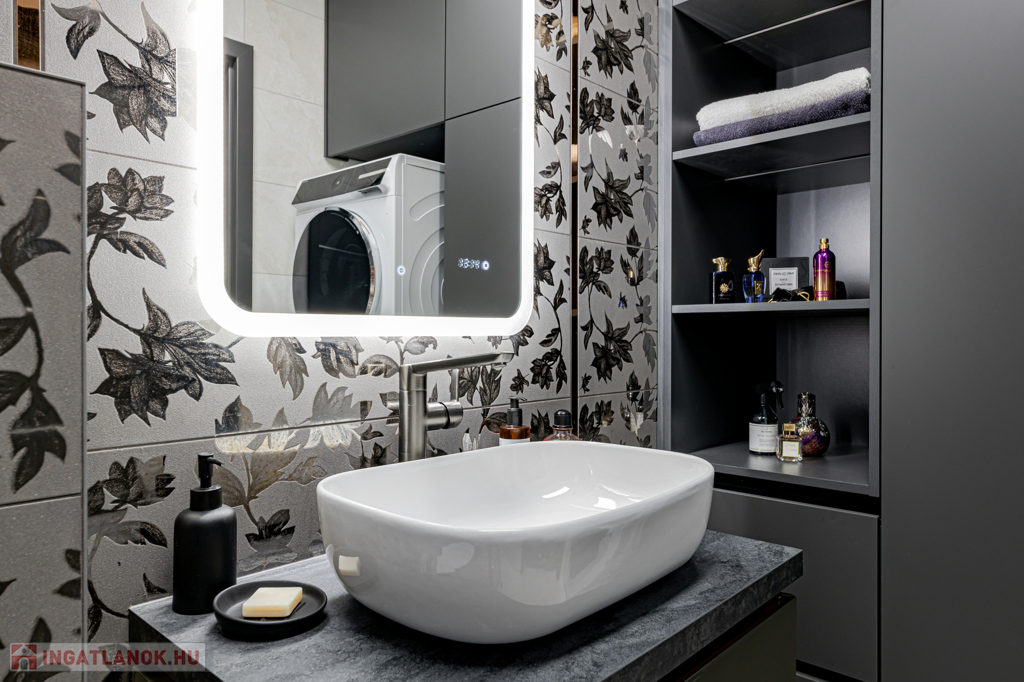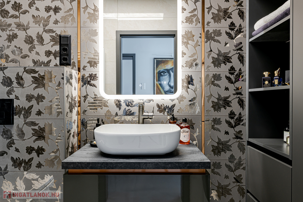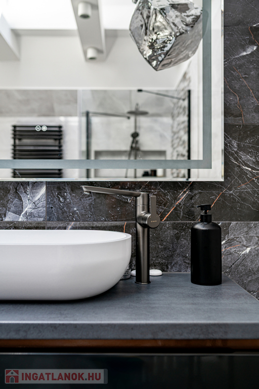 A fürdőszobákban prémium minőségű burkolatokat, Deante titánium, modern csaptelepeket, egyedi gyártású mosdószekrényeket, led prémium line érintőkapcsolós tükröt találunk.