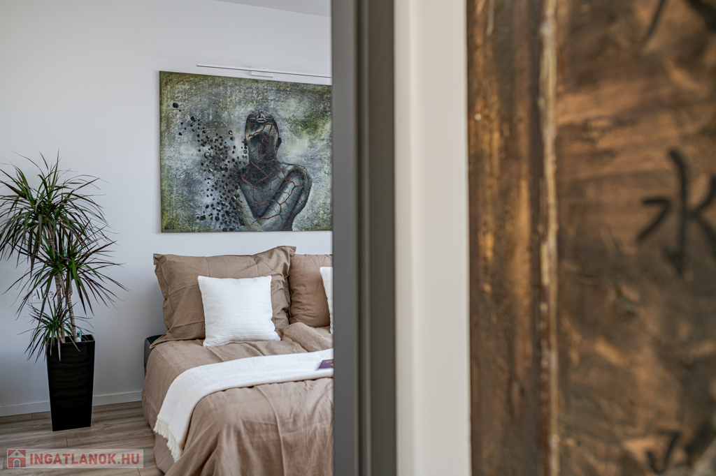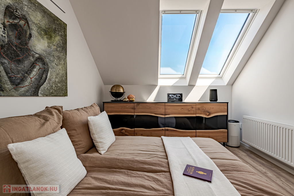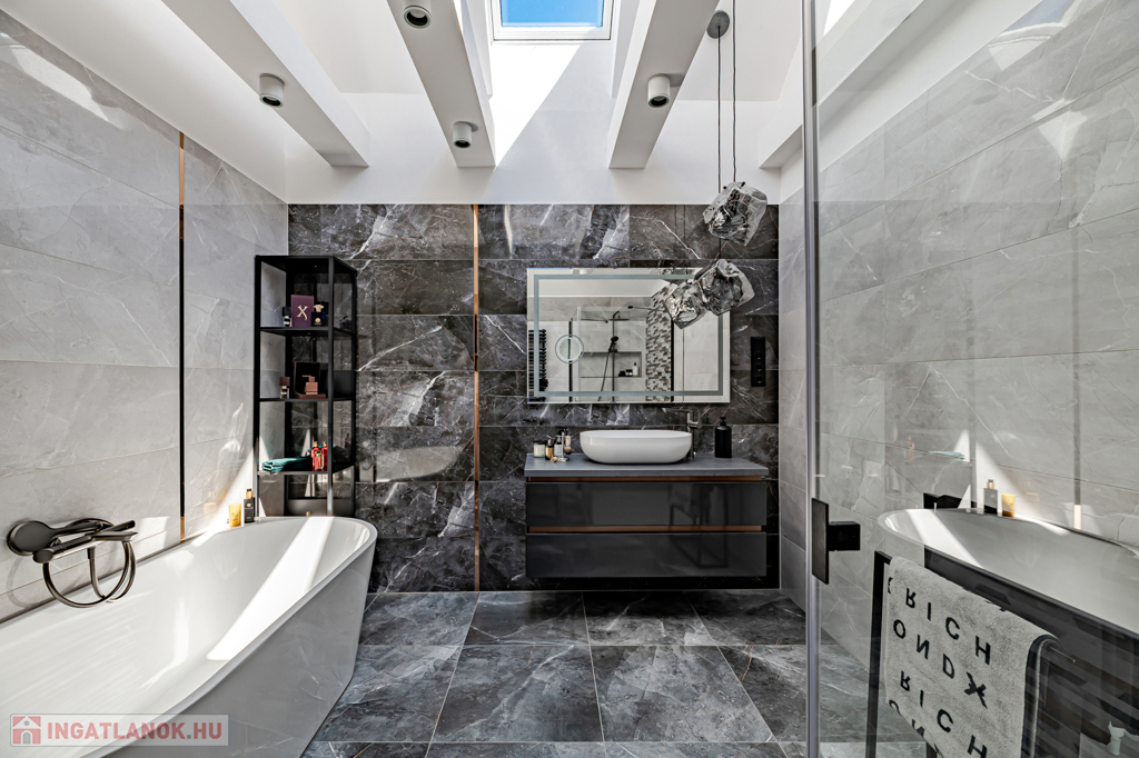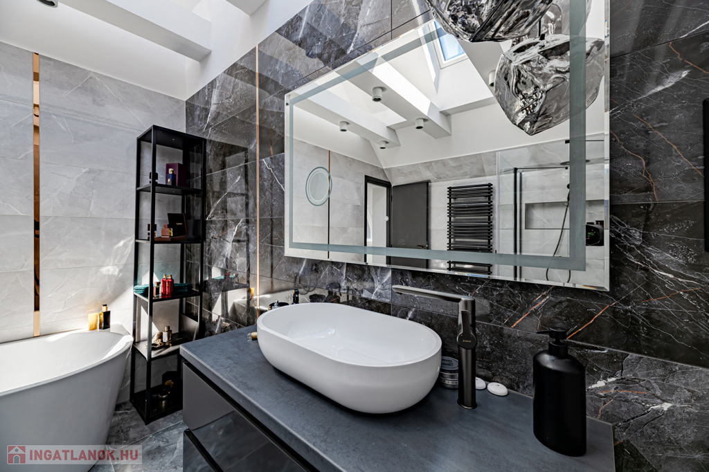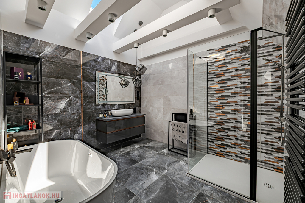 A lakás egyik különlegessége a felső szinten található hatalmas, világos fürdőszoba, a látszógerendákkal, kényelmes méretű zuhannyal, térkáddal, hangulatfényekkel.