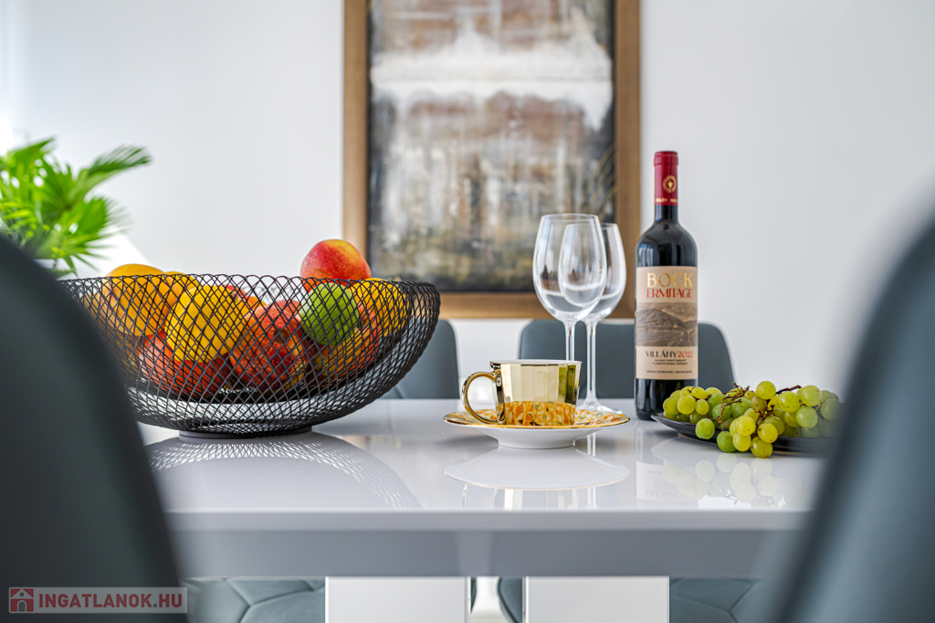 A konyhabútorba és a tálalóba minőségi, Bosch gépek kerültek beépítésre: mosogatógép, szagelszívó, sütő, főzőlap mikró, borhűtő, hűtőszekrény.)