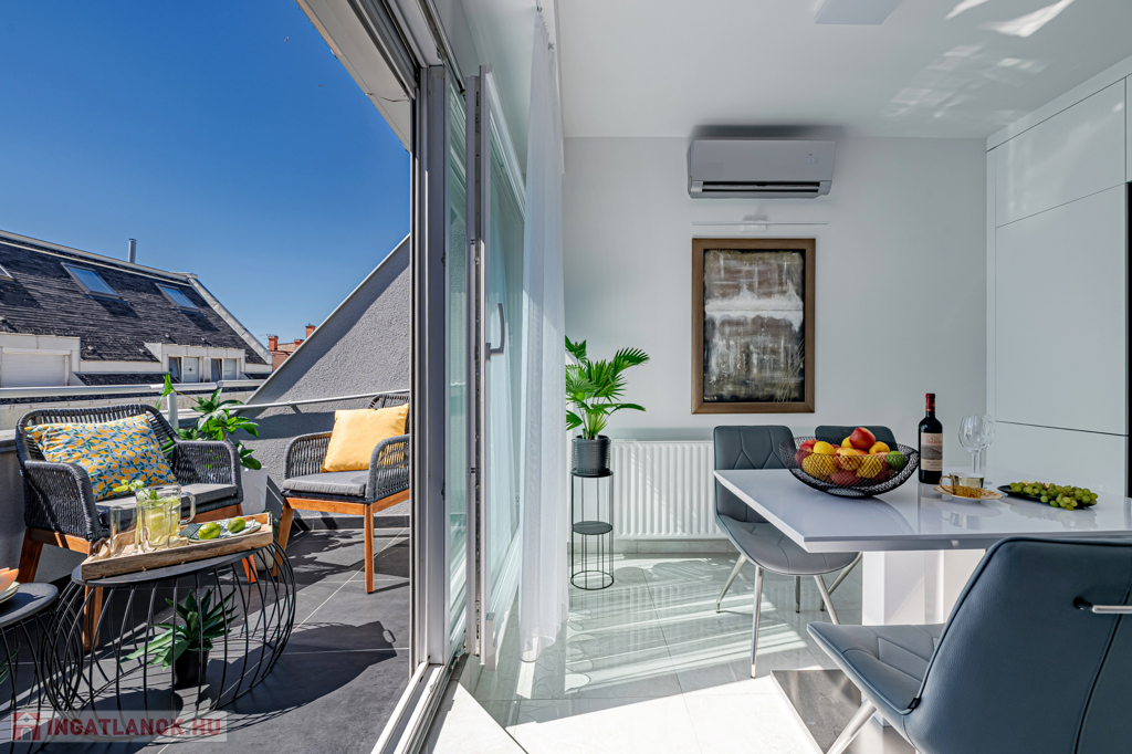 Belvárosban, liftes társasház felső szintjén, modern, minőségi otthon várja Tulajdonosát.