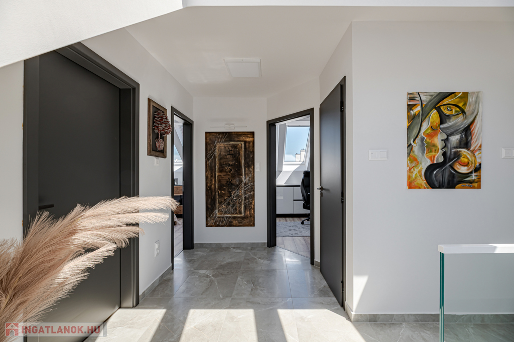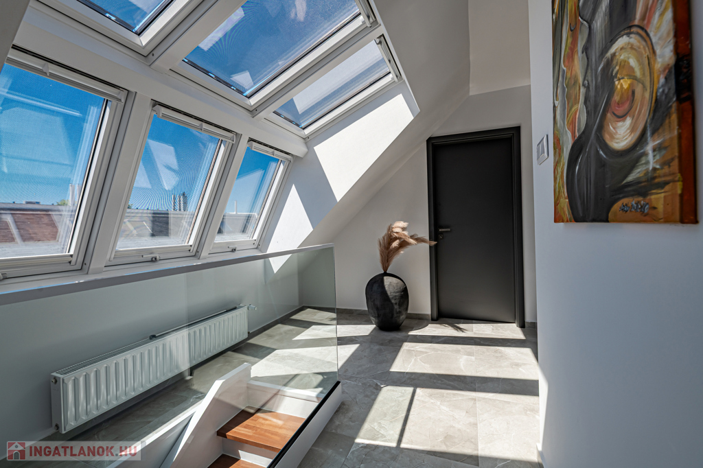 A 3 sorolt manzárdablaknak, köszönhetően fényárban úszik a közlekedő a többi helyiséggel együtt.
