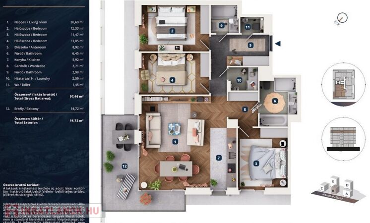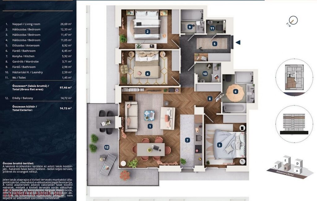 • 97,46 m² alapterület („nettó” 93,56 m2, „bruttó” 97,46 m2 alapterületű)