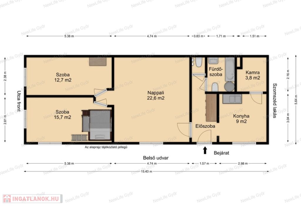 Elosztása: tágas nappali +2 nagy méretű hálószoba, egyikben galéria, fürdőszoba káddal, toalettel, illetve külön mellékhelyiség is kiépült a legutolsó felújítás alkalmával. Tágas konyha kamrával, előszoba beépített gardróbbal.