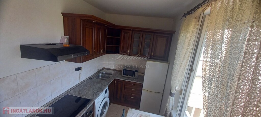 A távfűtéses ingatlan, jó minőségű konyhabútorral van szerelve, amelyben még a mosógép is helyet kapott.