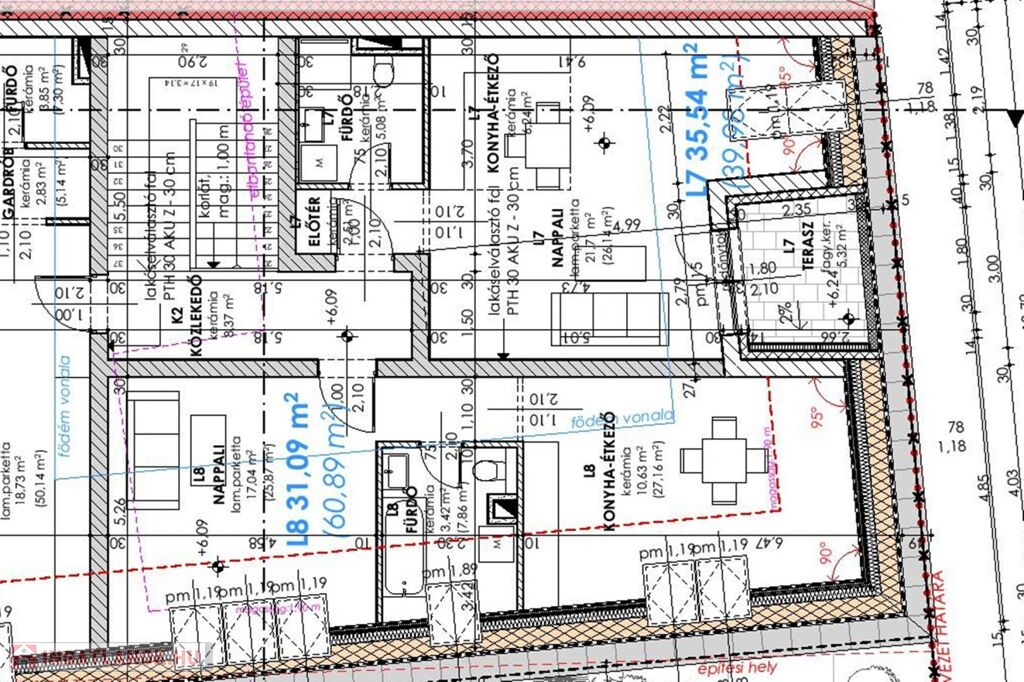 Tetőtéri L7 lakás bruttó 39,98 m2 (nettó 35,54 m2 ) helyiségei: amerikai konyhás nappali, fürdő WC-vel, előszoba, háztartási helyiség WC-vel, közlekedő. ERKÉLY 5,32 m2