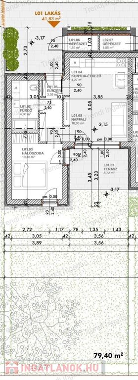 A meghirdetett földszinten található 40,02 nm-es lakásban amerikai konyhás nappali, szoba, fürdőszoba és előtér található. Nappaliból 8,72 nm-es terasz és 79,40 nm-es kertkapcsolat nyílik.
