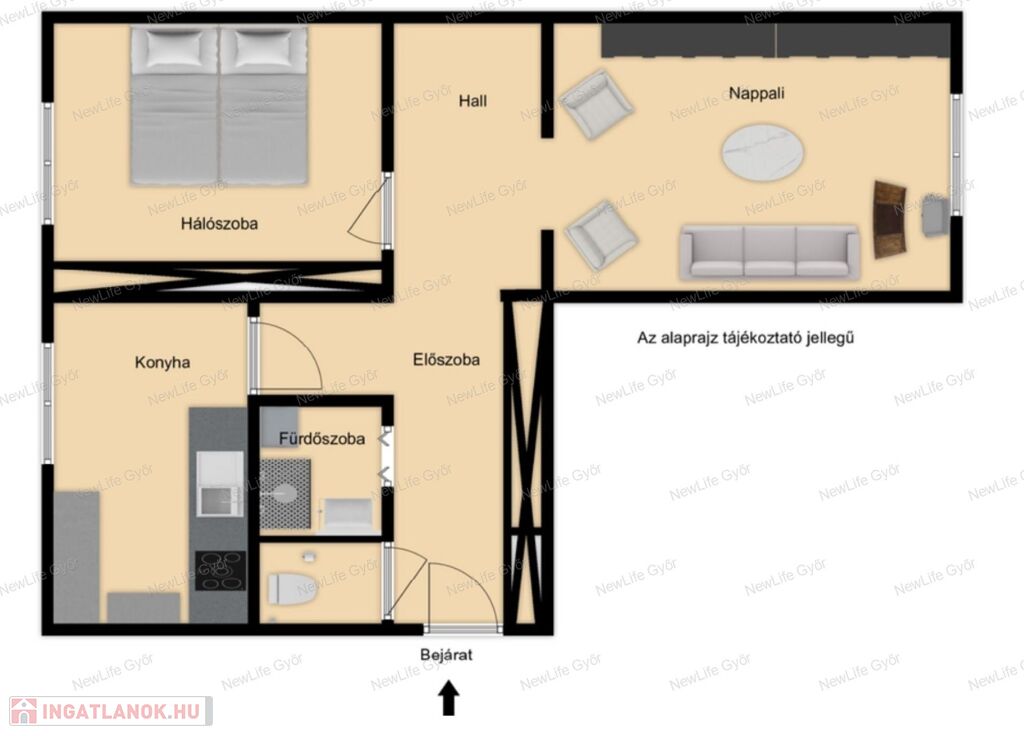 Elosztását tekintve: nappali hall, hálószoba, konyha, zuhanyzós fürdőszoba, külön WC.