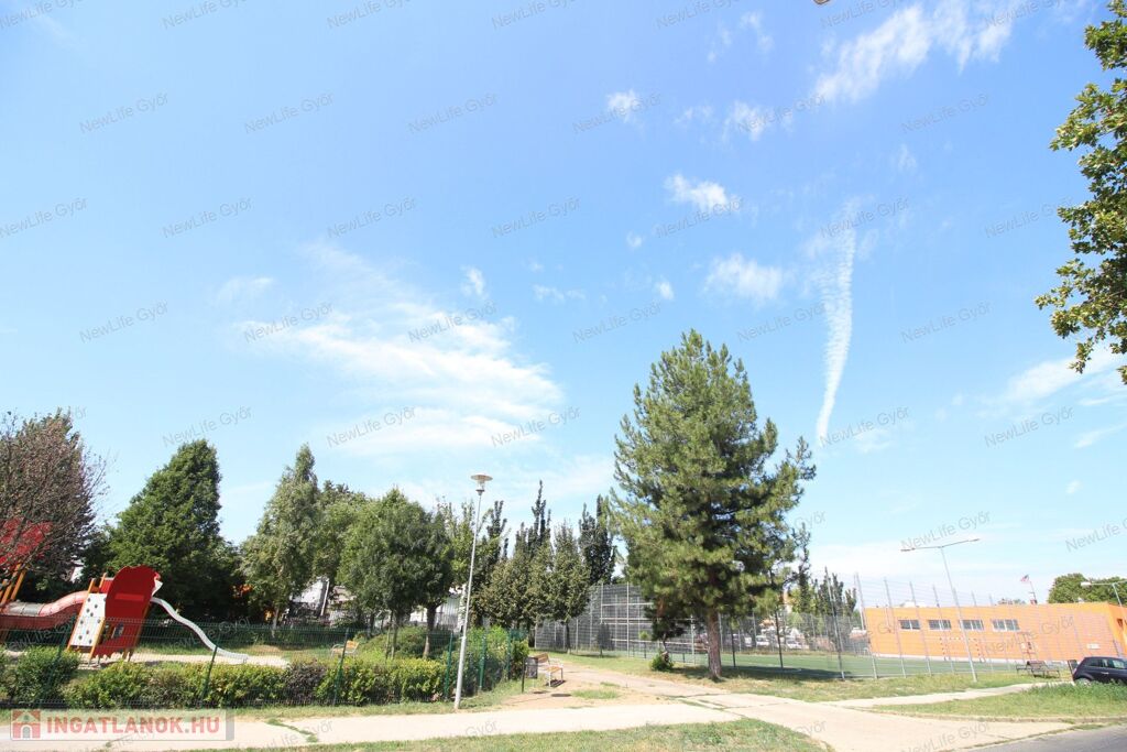 A lakás frekventált, mégis csendes helyen van, alacsony forgalmú utcában, ahonnan gyalogosan is mindent kényelmesen meg lehet közelíteni, autóval 1-2 perc alatt szinte mindent. Közel van az Árkád, ETO Park, Aldi, Lidl, Interspar, OBI, kisebb boltok, benzinkút, dohánybolt stb. Gyerekek számára bölcsőde, óvoda, iskola, gyermekorvos, valamint park és játszótér. A ház környékén a közterületen ingyenes a parkolás és mindig van szabadhely.