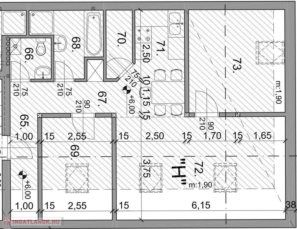 Nappali-étkező konyha, 2 szoba, fürdőszoba, háztartási helyiség.