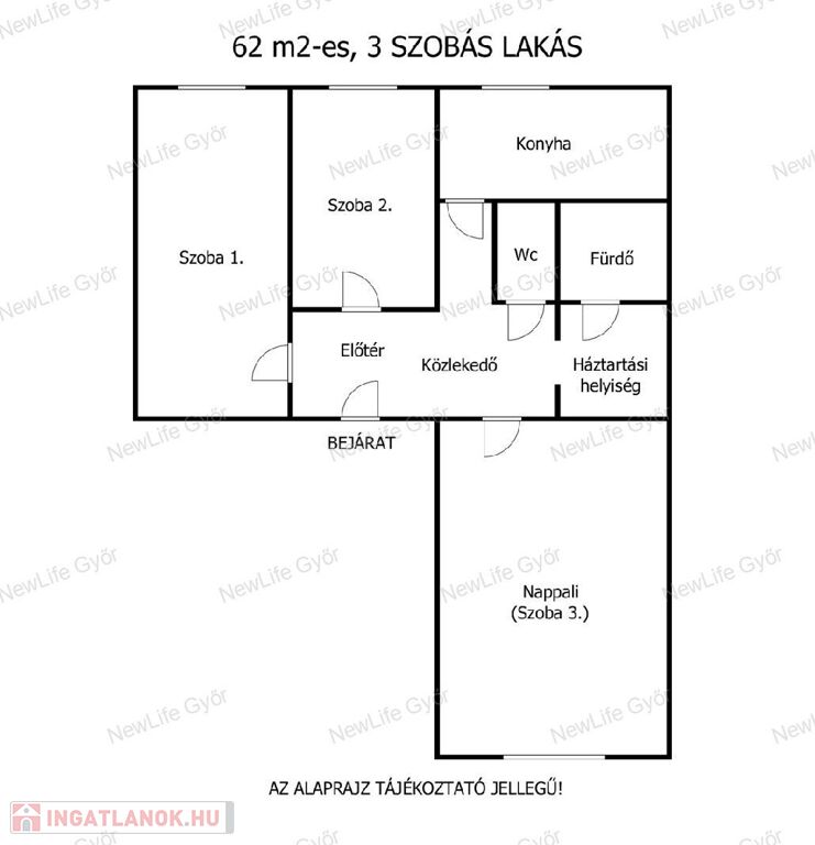 - nappali + 2 szoba (összesen 3 külön nyíló szoba)