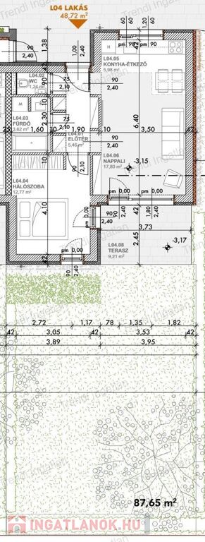 A meghirdetett földszinten található 48,72 nm-es lakásban amerikai konyhás nappali, szoba, fürdőszoba és előtér található. Nappaliból 9,21 nm-es terasz és 87,65 nm-es kertkapcsolat nyílik.