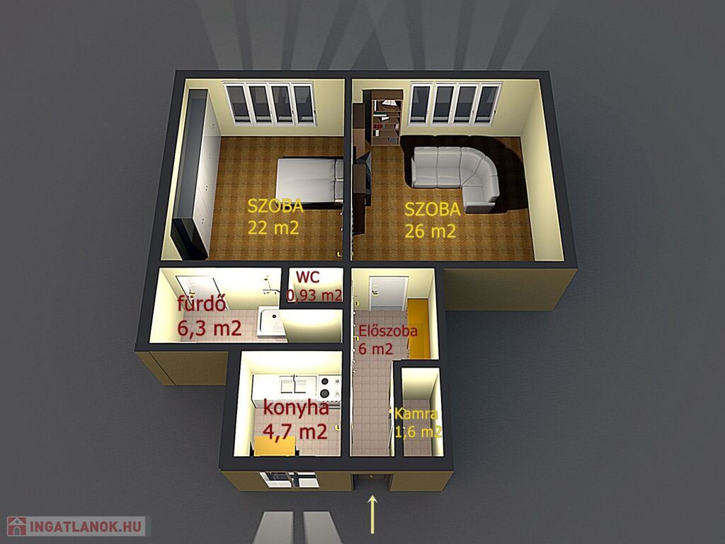 A lakás helyiségei: szoba 26 m2, szoba 22 m2, fürdő 6,3 m2, konyha 4,7 m2, külön WC 0,92 m2, előszoba 6 m2, kamra vagy tároló 1,6 m2.