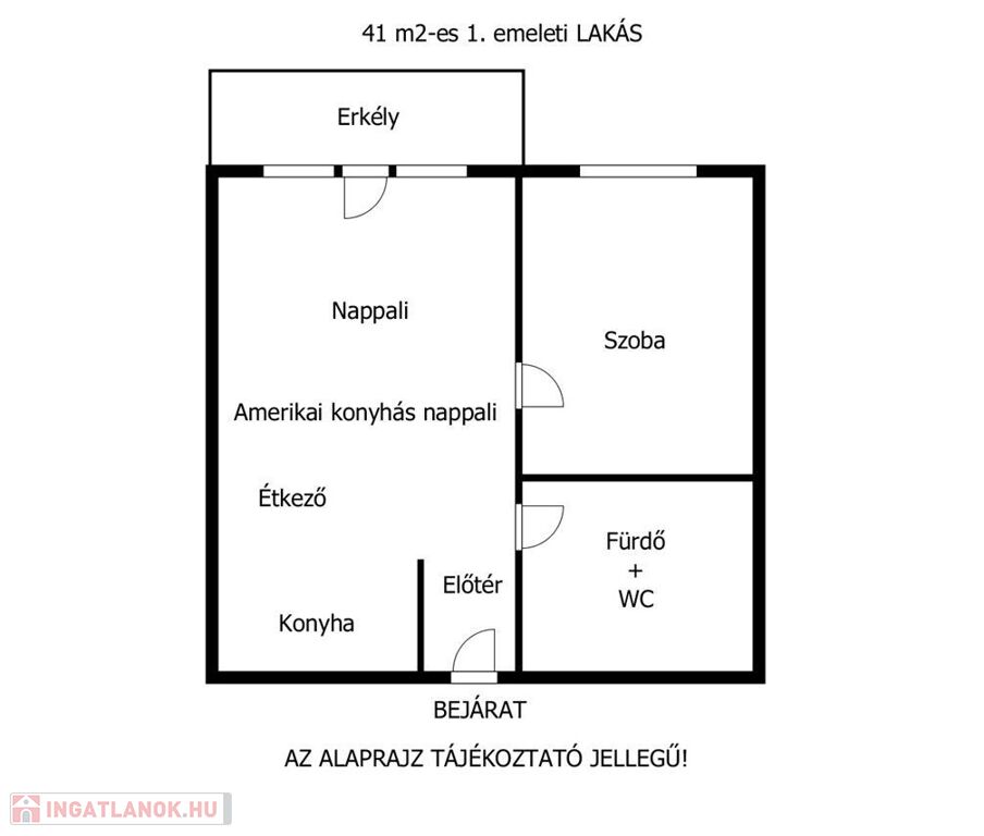 Elosztása: előtér, nappali–konyha–étkező, hálószoba, fürdőszoba–WC