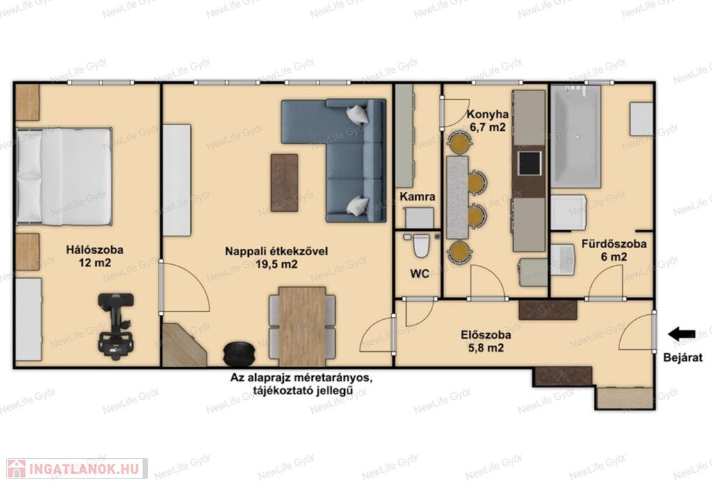 Elosztása: tágas nappali étkezővel, nagyméretű hálószoba, konyha, kamra, külön WC, kádas fürdőszoba, közlekedő.