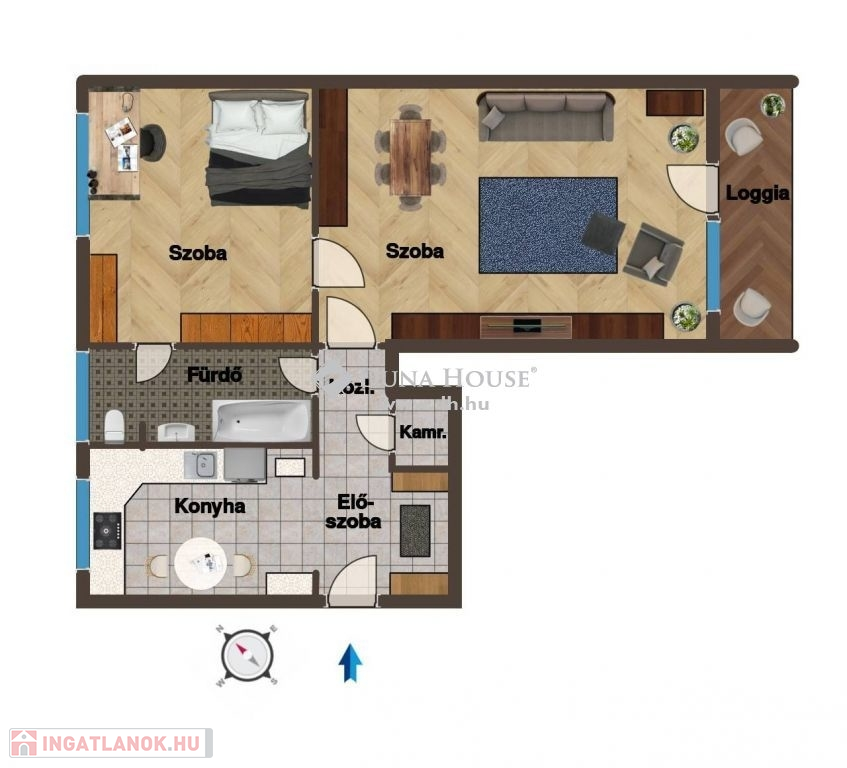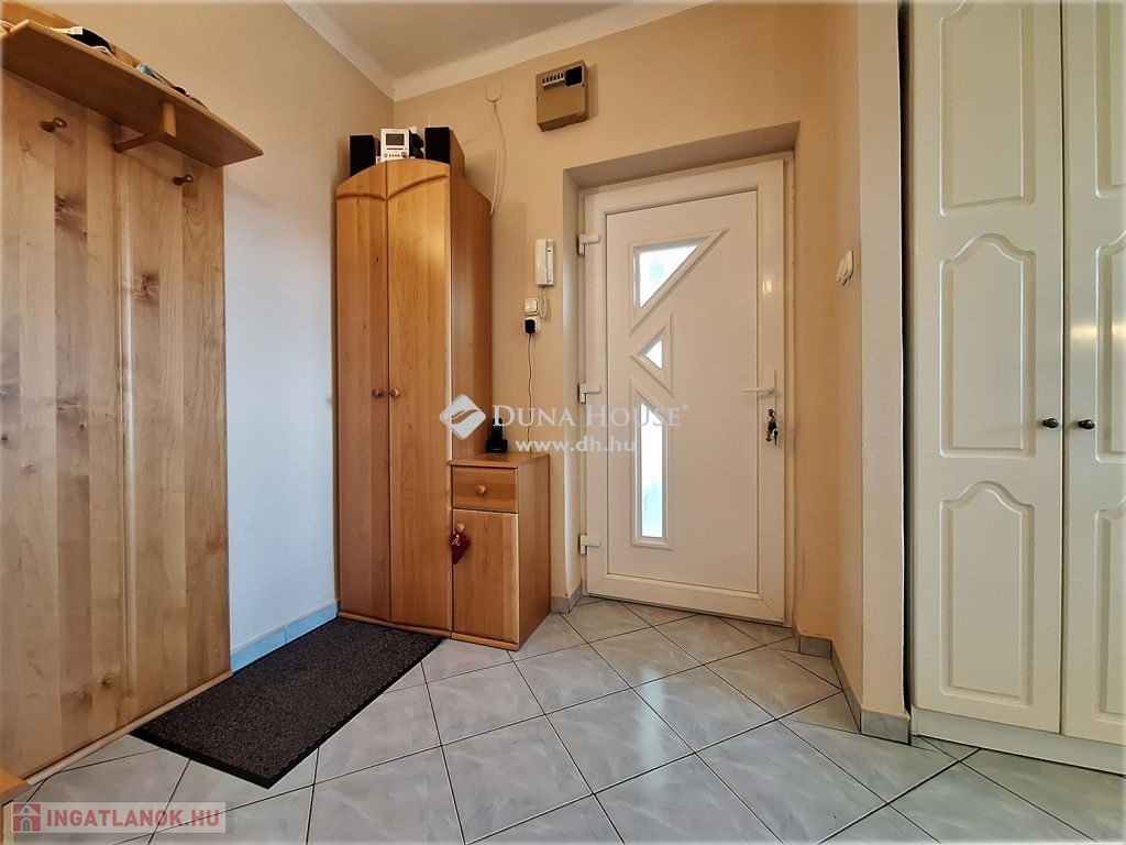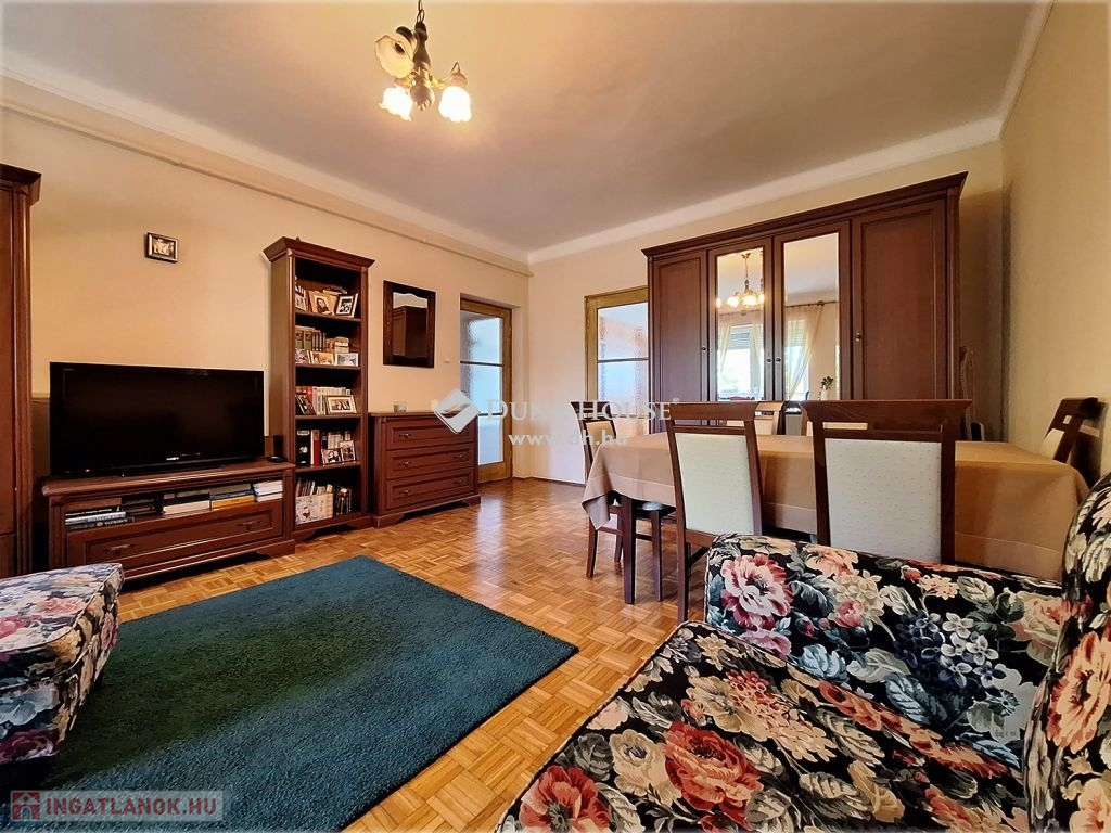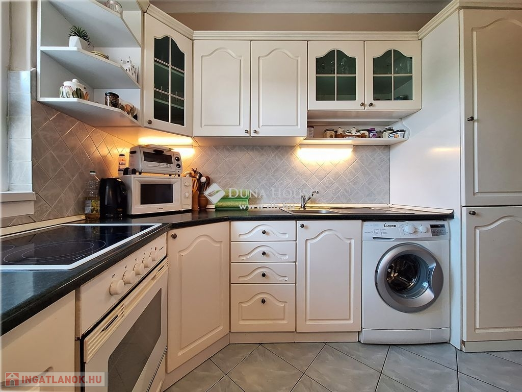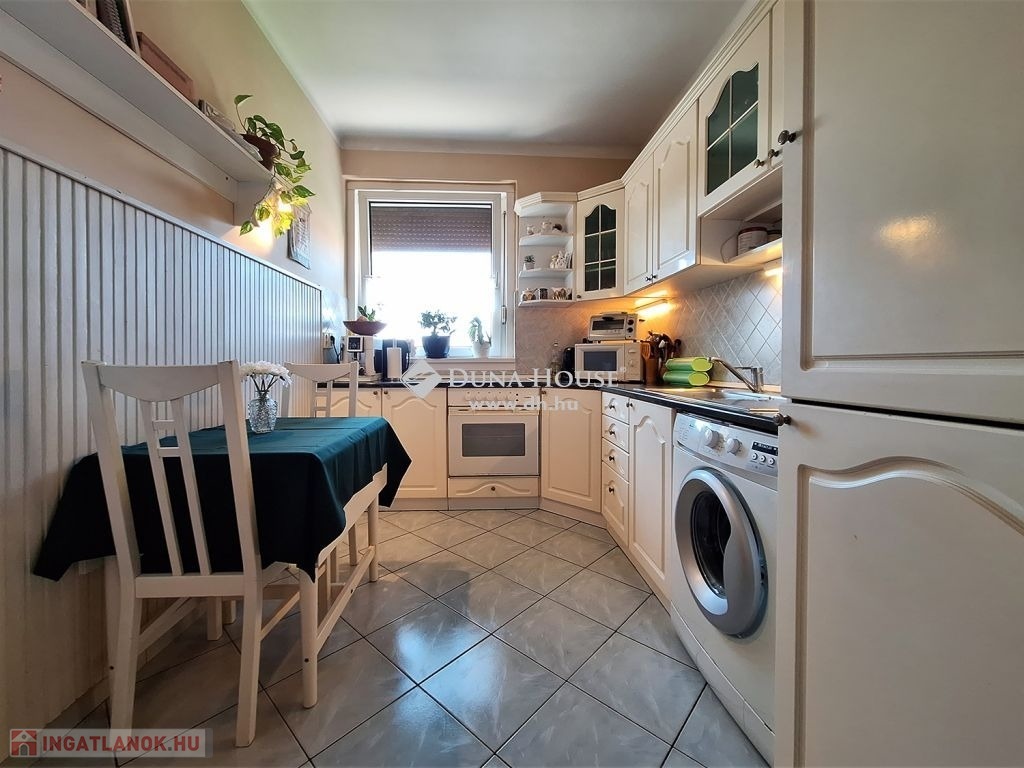 Az előszobába beérve kényelmes ülő és tárolófelület fogadja a hazaérkezőket, egy nyitott téren keresztül a konyhába invitálva. A konyhában elektromos főzőlap és sütő, valamint mosogató került beépítésre, továbbá itt kapott helyet a mosógép is. Méretéből kifolyólag a mindennapi étkezéshez is teret biztosít, a pakoláshoz számtalan szekrény áll rendelkezésre. A folyosón külön kamra rejti a hétköznapok finomságait. A fürdő a WC-vel egy térben, ám némileg elszeparáltan található, a hatalmas ablak világosságot, szellőztetést biztosít. A szobák nagy méretűek, jelenleg egymásból nyílnak, de apró leválasztással önállóan is megközelíthetőek. Mindkét lakóhelyiségben eredeti, kiváló minőségű fa parketta található, a többi helyiség kerámia burkolatos. A nagyobbik szoba a családi étkezésekhez is kiváló helyet biztosít, az esti kávézáshoz a 4,8 m2-es fedett loggia nyújt kellemes teret.