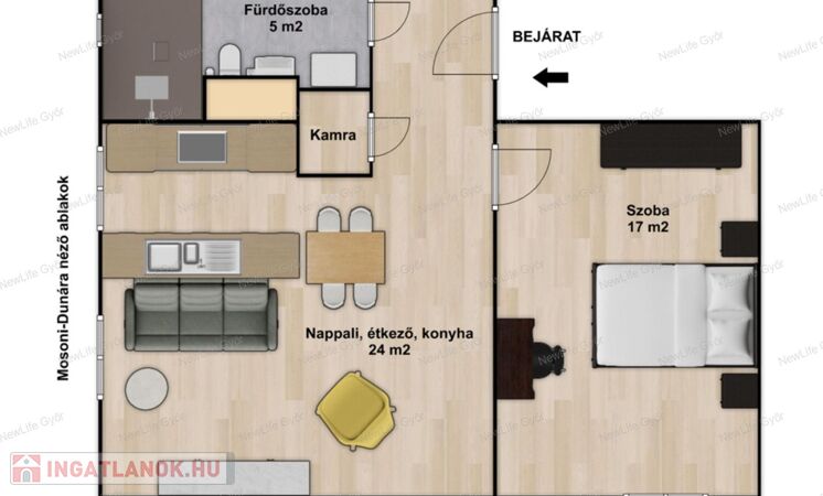 A nappali és konyha ablakból csodás kilátás nyílik a Mosoni-Dunára, ezen túl pedig üzletek, a belvárosi forgatag, Egyetem is szinte az ablakból látszik.