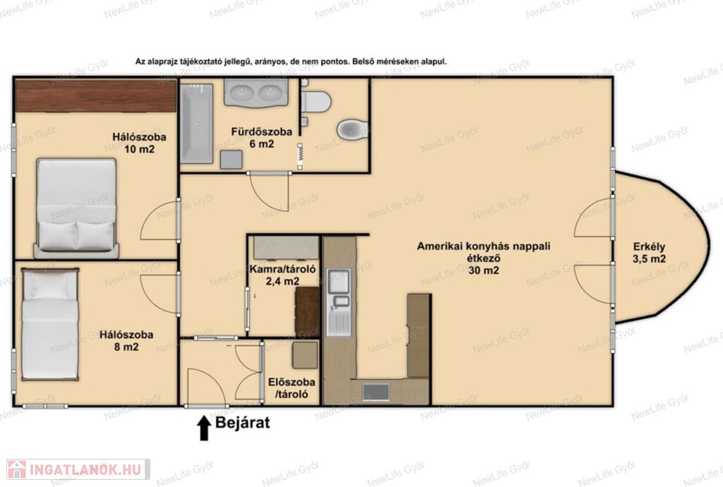 Elosztása: tágas amerikai konyhás nappali erkéllyel, 2 hálószoba, kamra, kádas fürdőszoba WC-vel, közlekedő.