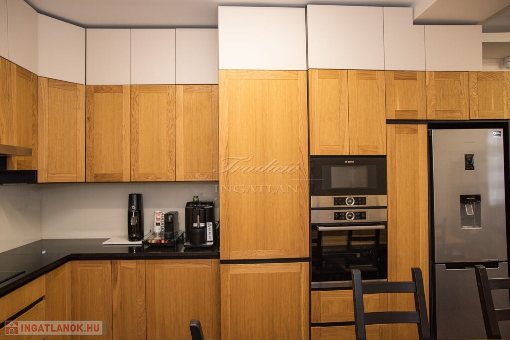 • Konyha: prémium VINYL burkolat, tömörfa konyhabútor, fekete gránit munkalap, lacobel üveg hátfal, beépített Bosch gépek, borhűtő, GREE inverteres klíma.