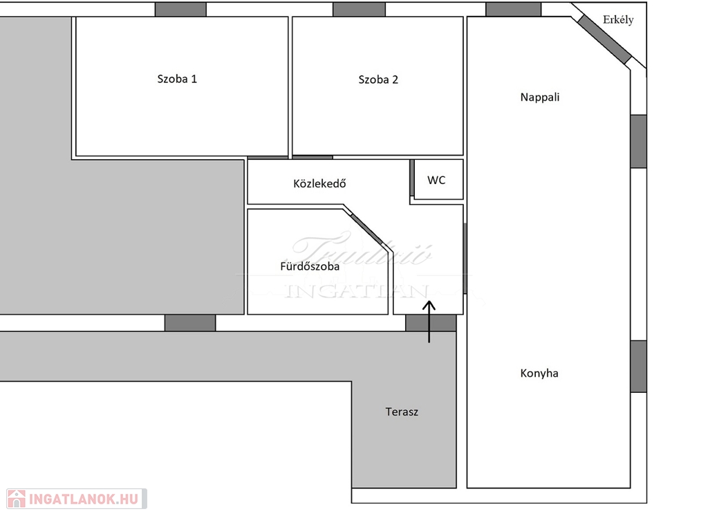 Elrendezés: A közlekedőből minden helyiség külön nyílik. A tágas nappali étkező és konyha közvetlenül kapcsolódik az erkélyhez; a két hálószoba igény szerint gyermek- vagy dolgozószobaként is használható. A bejáratnál lévő szeparált terasz pihenőhelynek is alkalmas.