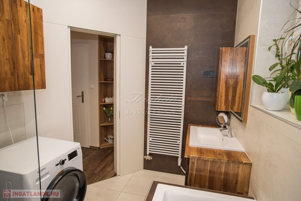 Energiahatékonyság és okosotthon: A lakás korszerű épületautomatizálási rendszere összehangoltan szabályozza az árnyékolást, a hővisszanyerős szellőzést, a radiátoros és elektromos padlófűtést, valamint a hűtést. Az automatizálás nemcsak kényelmet nyújt, hanem az iparági kutatások szerint átlagosan 5–15 %-kal is csökkentheti az energiafelhasználást. A 8 cm-es külső hőszigetelés, a műanyag nyílászárók és a precíz hővisszanyerős rendszer segítik a rezsi alacsony szinten tartását. A rendszer távolról vezérelhető, a beállítások okostelefonról módosíthatók, így mindig ideális hőmérséklet és friss levegő biztosítható.
