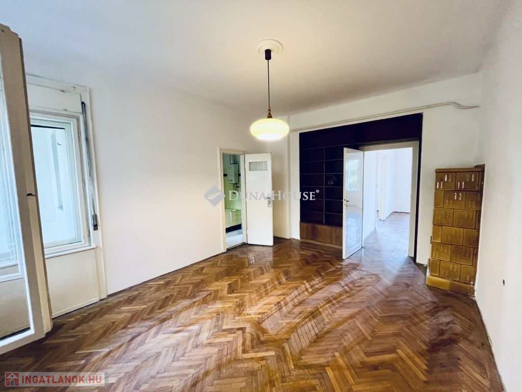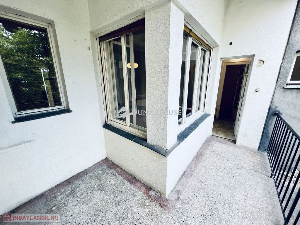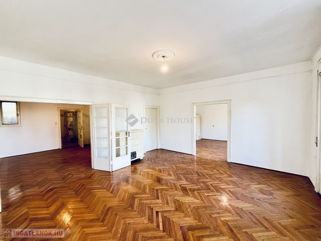 Az erkélyes nappali az Eötvös parkra néz. Egy Bauhaus ház 2. emeletén helyezkedik el ez a 144 négyzetméteres két erkélyes lakás.A lakás világos, körbe napozott, nagypolgári elrendezésű terekkel.Az alatta lévő emeleten ketté osztották az ugyan ilyen alaprajzú lakást.Ragyogó lehetőség irodának, rendelőnek, de akár egy gyönyörű nagyvonalú lakás is kialakítható itt.Az eredeti fa parketta szép állapotban van, a villany és vízvezetékek az új funkcióknak megfelelően kialakítandóak.A fa dupla nyílászárókat érdemes felújítani, modernizálni, de az eredeti kilincsek mindenhol megvannak!